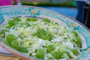 The newlyweds’ salad, a symbolic dish linked to traditional peasant wedding lunches. Prepared with raw savoy cabbage, grapes, a drizzle of oil and a pinch of salt, it brought freshness and lightness to the table on festive days. It was served in homes transformed for the occasion: rooms emptied of furniture, filled with chairs and crockery borrowed from neighbours, where entire communities gathered to celebrate the newlyweds. Simple in appearance, it embodies a long history of conviviality and sharing, as well as representing, perhaps unconsciously, a tribute to healthy and essential vegetable cuisine.