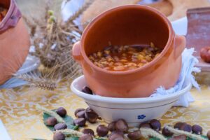 This soup exudes simplicity and rural traditions. Created from chestnuts, beans and potatoes, it evokes winter days when people drew on the supplies they had set aside after the harvest. Each step was a ritual of ancient gestures: careful cleaning, patient soaking, slow cooking that released warm and comforting aromas. Finally, garlic, oil and chilli pepper added character and intensity, transforming humble ingredients into a dish of extraordinary authenticity, capable of warming the body and heart.